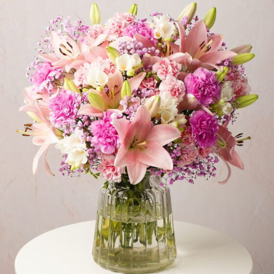 A delicate mixture of pale pink Asiatic Lilies alongside Carnations and pure white Freesias. Finished with sweet pink Gypsophila, it will make a gorgeous gift to send for a special occasion, or even just because!