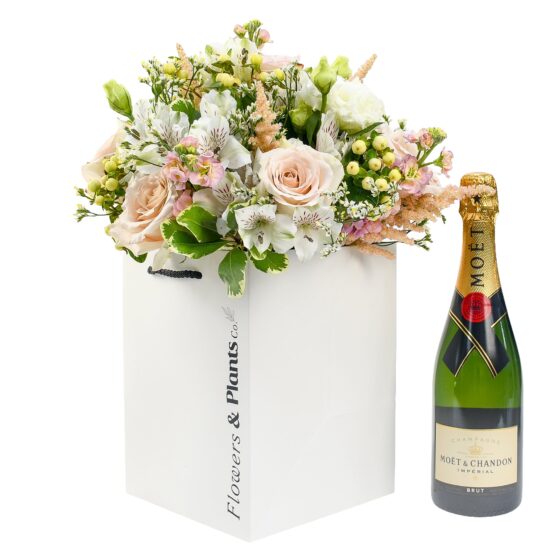 A wild and wonderful arrangement featuring our favourite roses, lisianthus, alstroemeria, hypericum & fresh foliage. Paired with a bottle of premium champagne it really is the ideal gift.